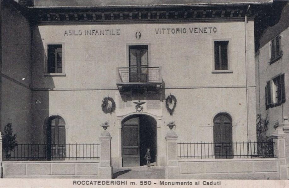 La facciata, semplice ed elegante, presenta, tra il portale principale e il terrazzo del primo piano, l’epigrafe in marmo con ornamenti in bronzo che commemora i soldati caduti in guerra e l’anno di inaugurazione dell’asilo-ambulatorio. Il fronte laterale della casa confinante che prospetta sul Centro Civico nel 2024 è stato recentemente adattato per accogliere il dipinto murale dell’artista Carlo Cialli raffigurante Mina e Fredi.