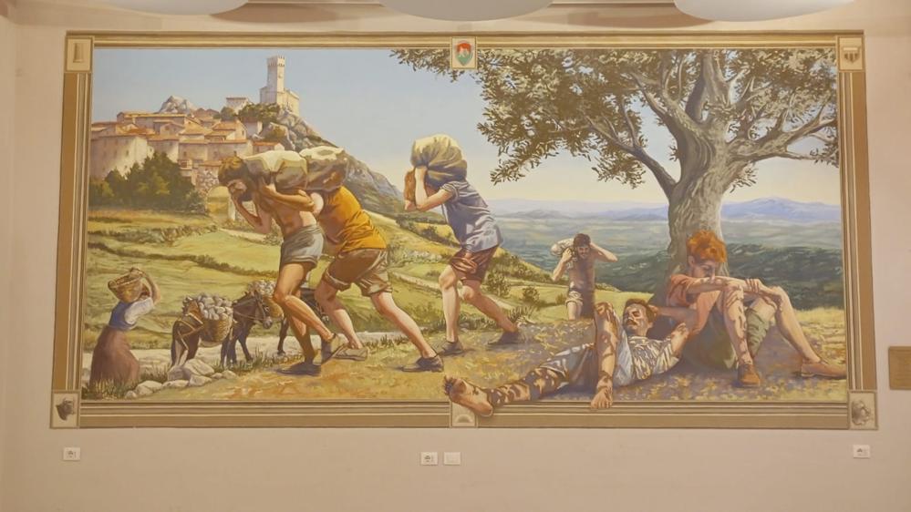 Il Centro Civico è stato inaugurato il 16 settembre 1928 e, inizialmente, era adibito ad asilo e ambulatorio. La struttura è costituita da due livelli: a piano terra sussiste la sala principale, di ampie dimensioni, dove, nella parete di fondo, sussiste l’affresco dal titolo: EX LABORE FRUCTUS (fig. 1). Quest’opera, realizzata nel 2019 e dedicata al pittore locale Bruno Marini, nasce dalla proficua collaborazione tra il Comune di Roccastrada, la Proloco di Roccatederighi e l’Accademia delle Belle Arti di Firenze a cui partecipano gli artisti: Valentina Luzzi, Irene Lombardi, Kristian Lepuri, Michele Lafrancesco, Calogero Saverio Vinciguerra (fig. 2). La sala suddetta, su ciascun lato, è affiancata da un ambiente dotato di un proprio ingresso autonomo. Il primo piano, raggiungibile da una pregevole scala interna, è costituito da alcune stanze attualmente in uso dalla Proloco di Roccatederighi.