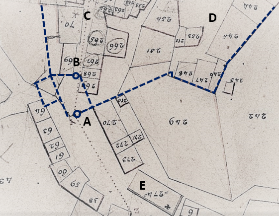 Individuazione delle due porte a difesa del castello di Roccatederighi (da Caporali 2019, p. 83) Legenda: A. Antiporta; B. Porta di accesso al Borgo; C. Via interna al borgo; D. Area signorile; linea tratteggiata: tacciato delle mura medievali del castello.