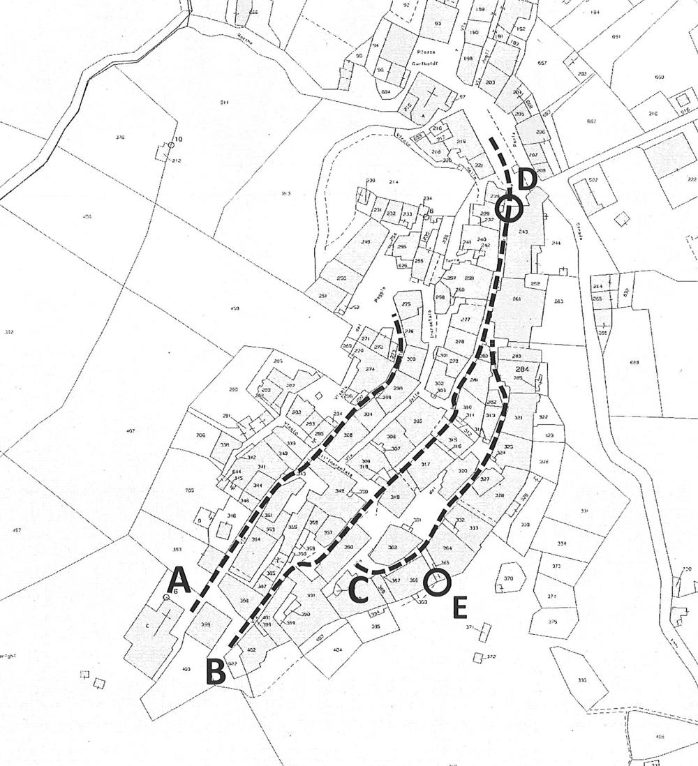 La viabilità del castello di Roccatederighi e le sue porte (da Caporali 2019, p. 83) Legenda: A. Ruga di sopra – oggi via della Torre; B. Ruga di mezzo; C. Ruga di sotto – oggi via del Tufolino; D. Porta principale di accesso al borgo; E. La Ciola, porta secondaria.