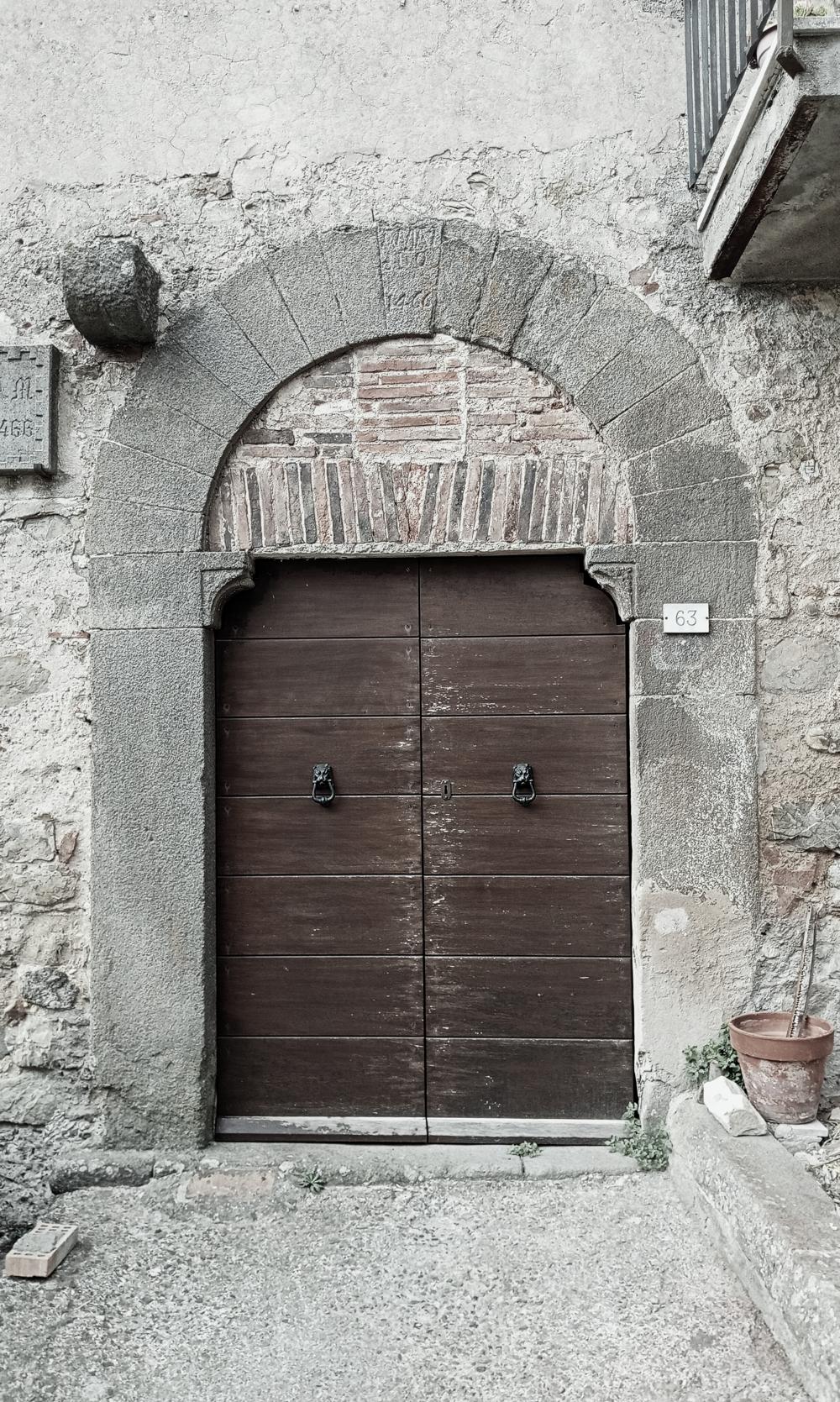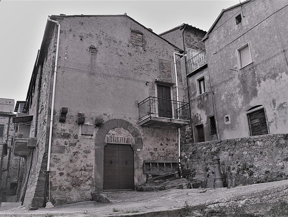 La facciata principale, orientata verso la Porta del borgo, è contraddistinta da un pregevole portale con l’arco a tutto sesto costituito da blocchi di trachite finemente lavorati dove l’architrave, che definisce superiormente l’apertura, è sorretto da mensole, e presenta la data incisa 1466 (fig. 2). Nella testata angolare, sono presenti alcuni beccatelli che confermano l’esistenza originaria di una struttura difensiva in aggetto destinata a proteggere l’ingresso principale e l’edificio stesso. Nel fronte laterale, in direzione della Ciola, sussiste un altro portale che interrompe la particolare conformazione del muro ‘a scarpa’, quest’ultimo chiaro riferimento all’architettura militare (fig. 3). Se le fonti al momento tacciono circa la storia di questo edificio, la posizione centrale rispetto al contesto urbano, la presenza della piazza e di elementi architettonici qualificati da specifici linguaggi espressivi permettono di individuare, nella Casa del Bellino, la sede del Comune di Roccatederighi, quest’ultimo istituito nel 1406. In questo contesto se nulla è dato sapere sull’aspetto e sull’assetto dell’edificio lungo il XV secolo, il pregevole portale presente nel fabbricato confinante nell’antica via di Mezzo suggerisce come la sede del Comune di Roccatederighi avesse dimensioni maggiori rispetto all’attuale Casa del Bellino (fig. 4).