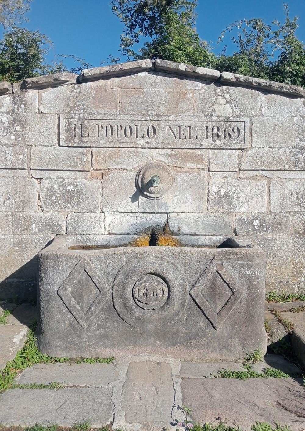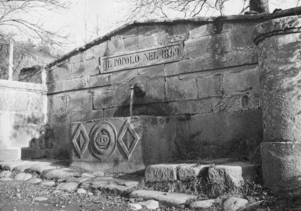 La struttura in muratura è stata concepita per contenere il terreno adiacente ed è stata realizzata in blocchi di trachite e inquadrata, su ciascun lato, da piloni, in parte caratterizzati dalla forma semicircolare; l’iscrizione incisa “Il Popolo nel 1869” conferma l’anno di costruzione e il contributo della cittadinanza in questa impresa edilizia. L’acqua, che fuoriesce dal beccuccio in bronzo, è racconta in una vasca rettangolare qualificata da un pregevole bassorilievo: al centro, l’elemento circolare si distingue per l’incisione 1869 e, su ciascun lato, è affiancato da una decorazione a rombo (fig. 3).