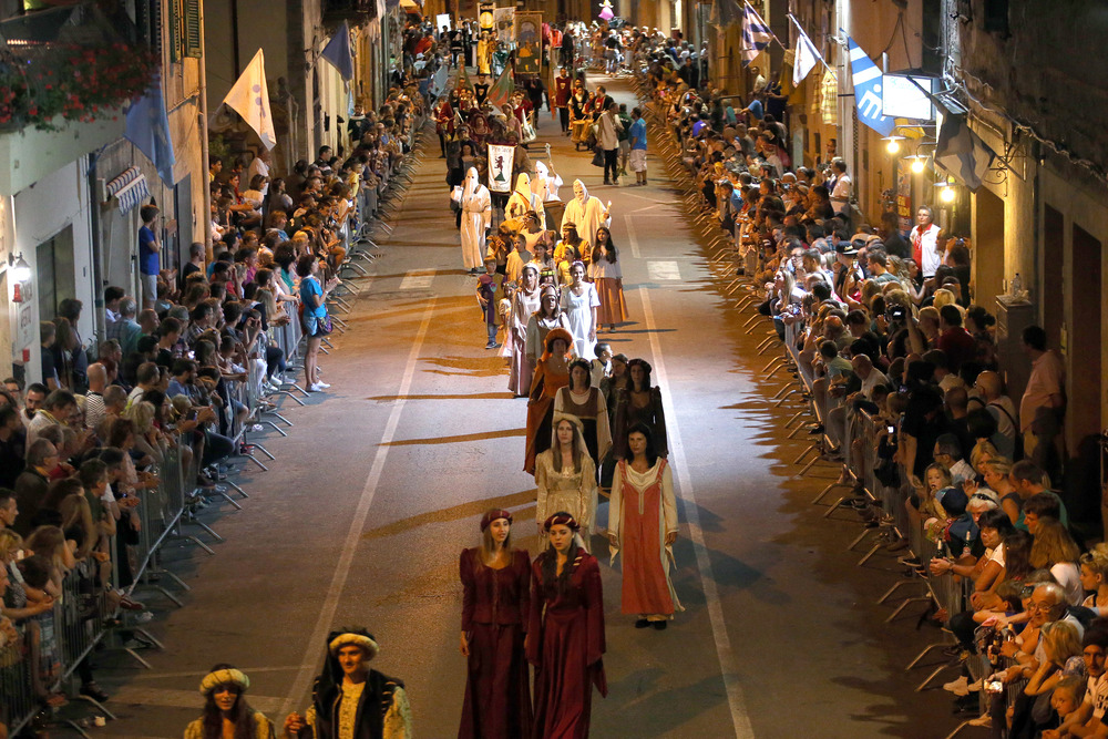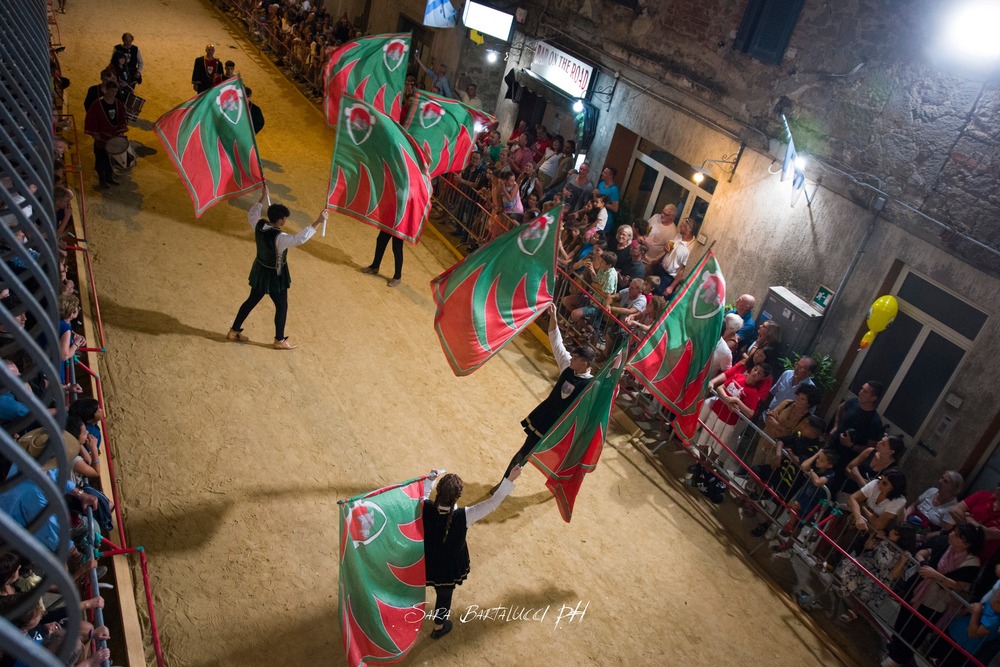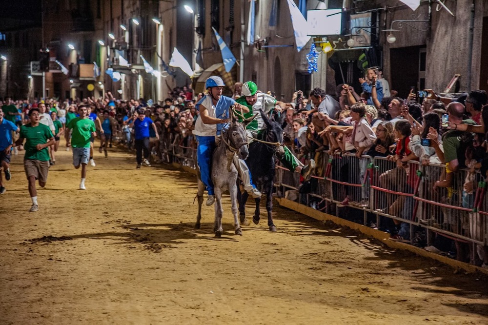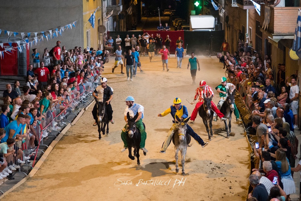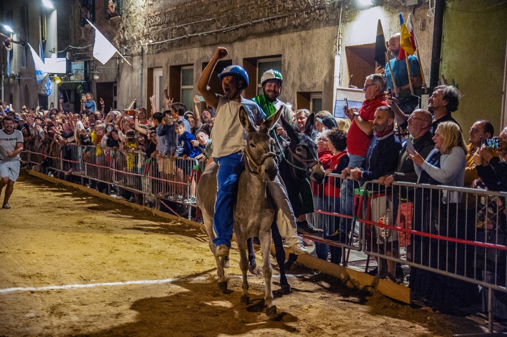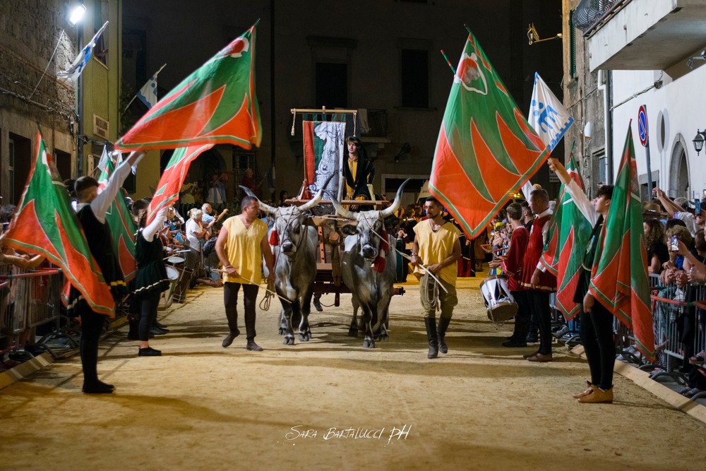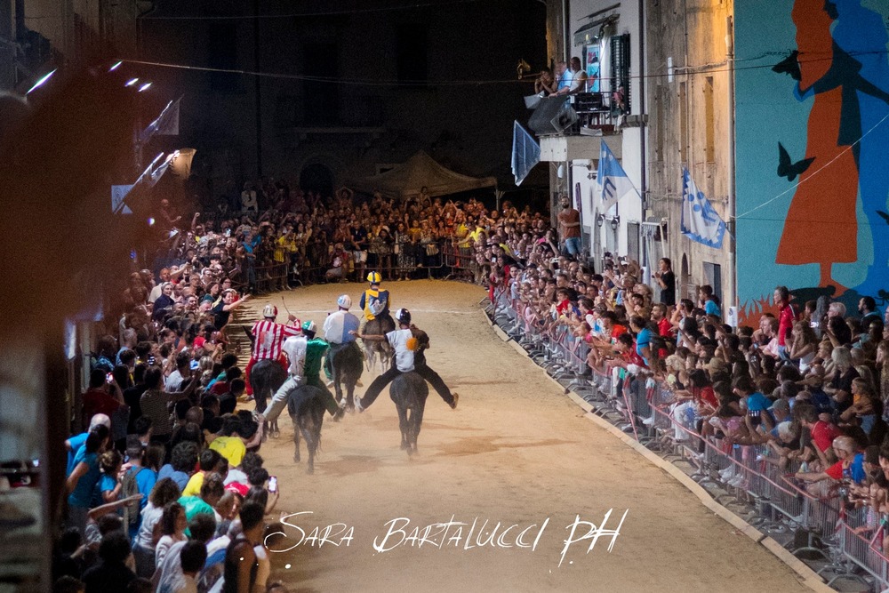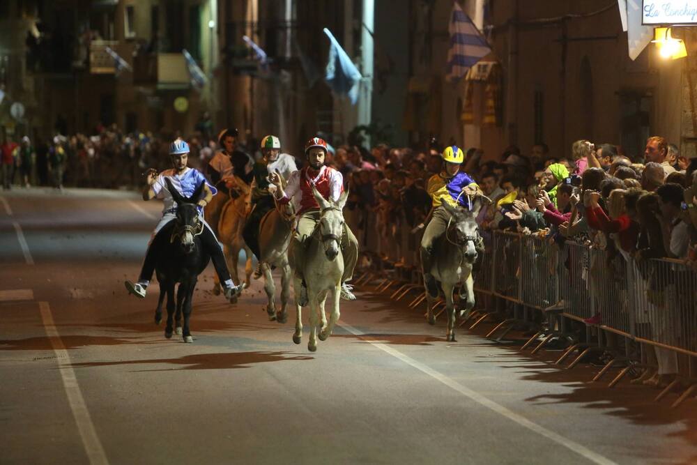 Cinque contrade – Corso, Torre, Tramonto, Nobili e Ventosa – si sfidano nella via principale del borgo per conquistare il Palio, un drappo dipinto ogni anno da un'artista diverso. Prima della corsa, il paese si trasforma in un grande palcoscenico a cielo aperto con il suggestivo corteo storico.